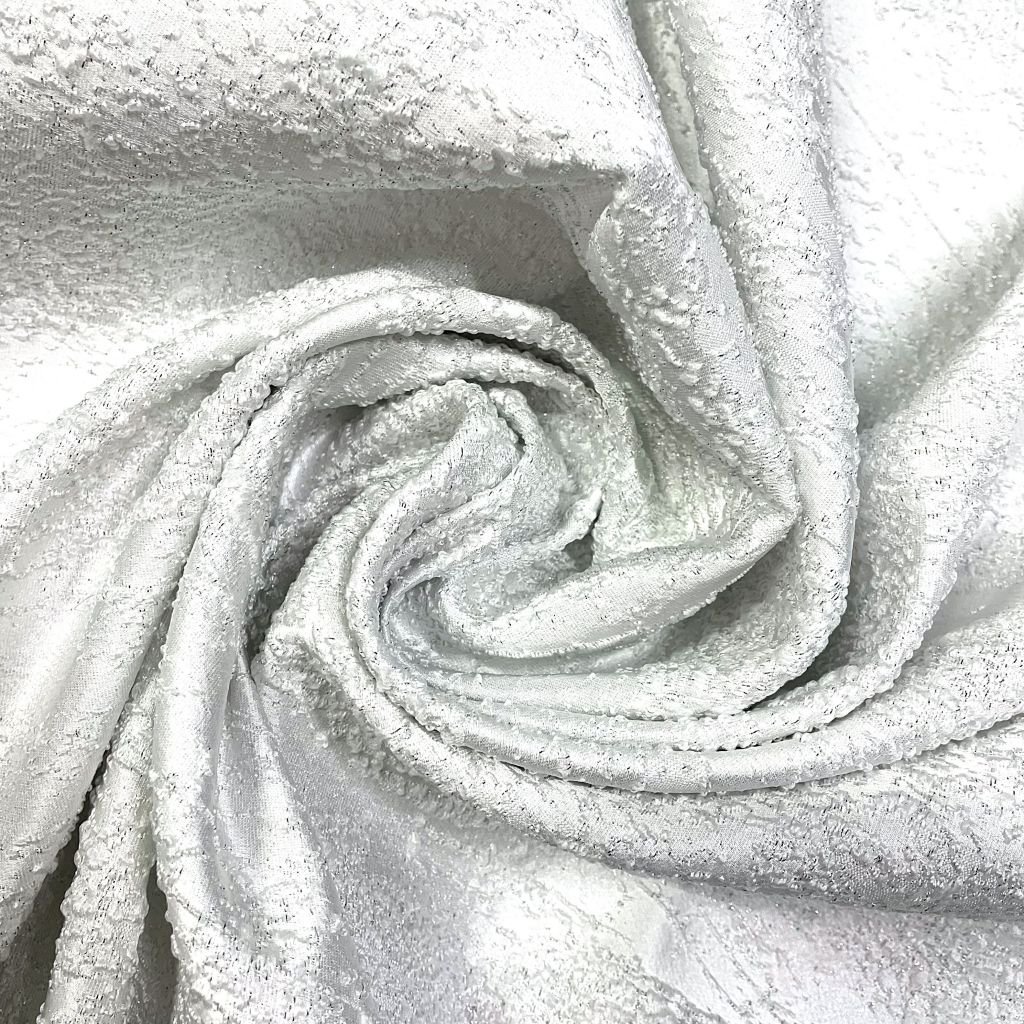 Это декоративная ткань, часто с объемным, выступающим рисунком .При изготовлении используется несколько типов волокон , что позволяет создавать сложные узоры. Вплетена металлизированная нить. Несмотря на свою объемность, ткань прекрасно драпируется, выкладывается в нужный силуэт. Используется для пошива пальто, жакетов, костюмов, юбок, платья, как повседневного так и праздничного направления.